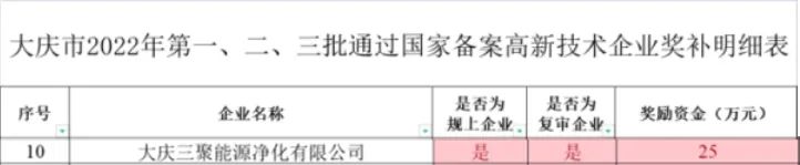 根據(jù)《中共黑龍江省委辦公廳 黑龍江省人民政府辦公廳關(guān)于印發(fā)<新時代龍江人才振興60條>的通知》文件精神,大慶市科學(xué)技術(shù)局近日將大慶市2022年第一、二、三批通過國家備案的高新技術(shù)企業(yè)獎補名單及獎補金額予以公示。海國投旗下海新能科所屬企業(yè)大慶三聚公司獲得25萬元獎補資金。